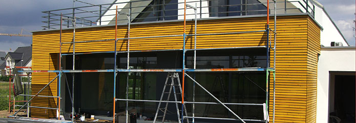 Immer beliebter werden Fassaden aus Holz. Eine Holzfassade zeichnet sich durch eine hohe Gestaltungsfreiheit, gute Haltbarkeit und Langlebigkeit - eine hervorragende Wärmedämmung und kurze Bauzeiten aus. Die Beachtung der Maßnahmen für den Baulichen Holzschutz sind für uns selbstverständlich und die Voraussetzungen für die lange Lebensdauer und eine dauerhaften hervorragenden optischen Eindruck der Holzfassade. Wir beraten Sie gerne über die Vorzüge einer Außenwandverkleidung aus Holz.